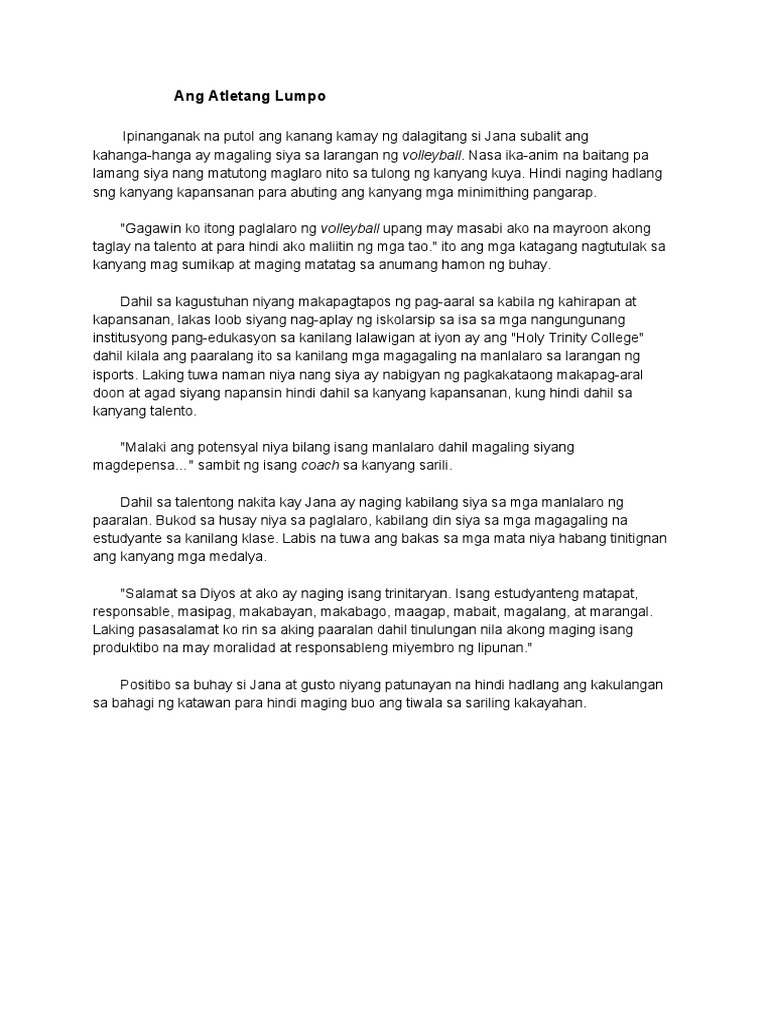 Naipakikita nito ang kultura ng mga Pinoy na handang magbigay ng. Maikling kwento ay isang maigsing salaysay hinggil sa isang mahalagang pangyayaring kinasasangkutan ng isa o ilang tauhan at may iisang kakintalan o impresyon lamang. Ang pagsusulat ng talata tungkol sa sarili ay dapat galing sa inyong sariling pag-iisip.